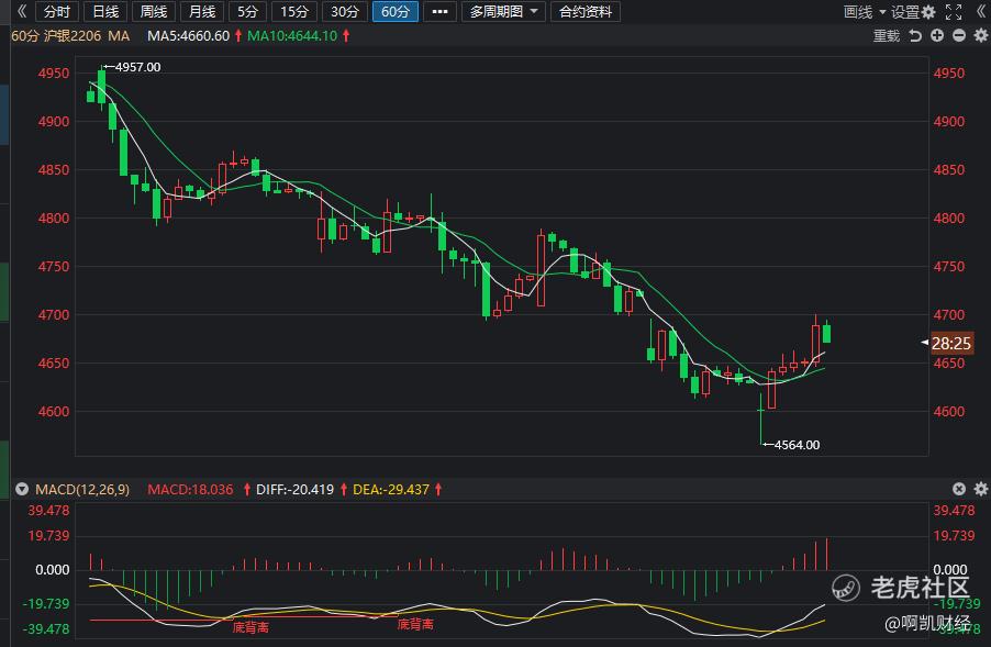【沪银2206主力合约】:上周五银价跌至历史新低,周线上,周线已经4连阴,空头势能强劲,周线上均线也是死叉向下发散保持良好:从小时图看,MA5和MA10均线贯穿形成金叉,均线向上运行走势,MACD红色动能柱能量充足,0轴之下金叉形成,金价将迎来暂时的反弹,应控制仓位小止损博反弹,蜡烛从布林带下轨冲破中轨,沪银趋势空头 ,短期承压运行,震荡思路对待,操作上关注4700一线压制有效性高空参与,调整预期。