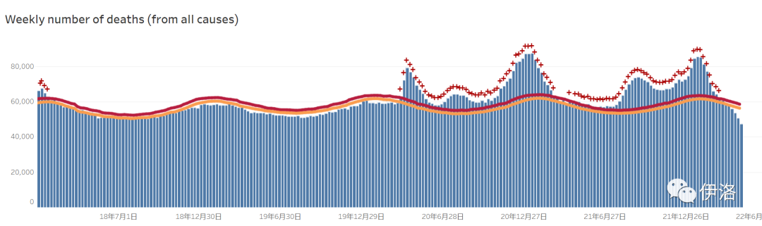 但考虑没有考虑超级的流行性?感染人群基数大幅上升,全社会总死亡人数不比之前少太多(美国今年4个月报18万死亡,过去两年报80万)。下图右侧可见年初奥密克戎超额死亡的峰值,并不比之前缓和多少,数据还尚未收集完全。