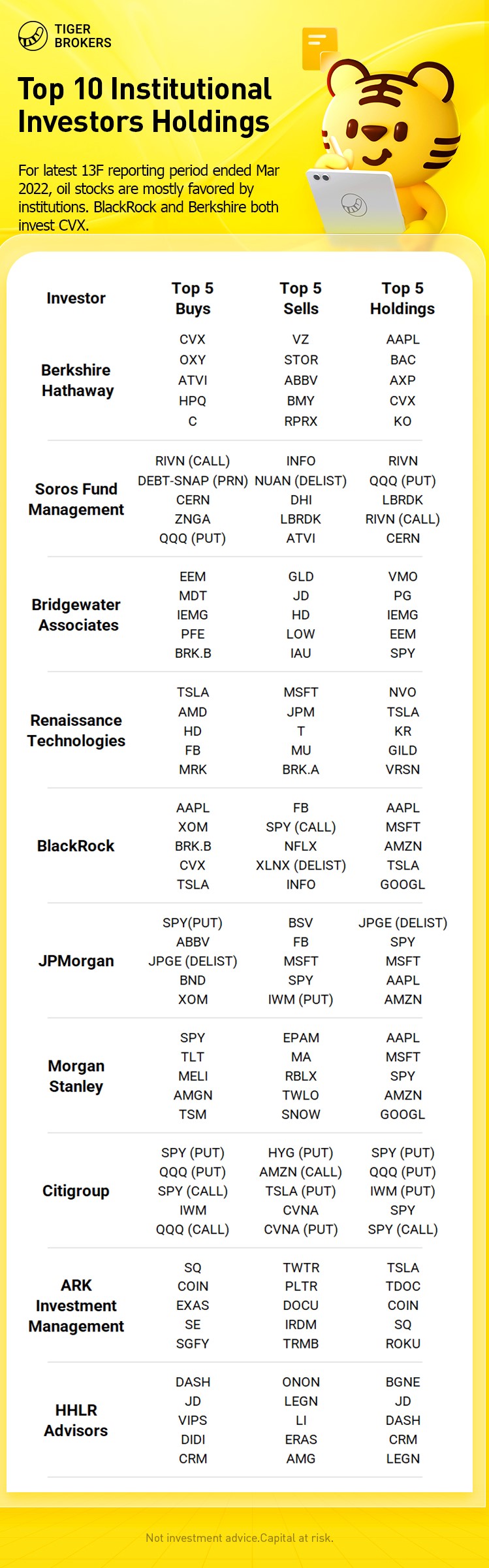 Oil Stocks are mostly favored by institutions, Berkshire and BlackRock both invest $Chevron(CVX)$, and JPMorgan buys oil giant $Exxon Mobil(XOM)$.