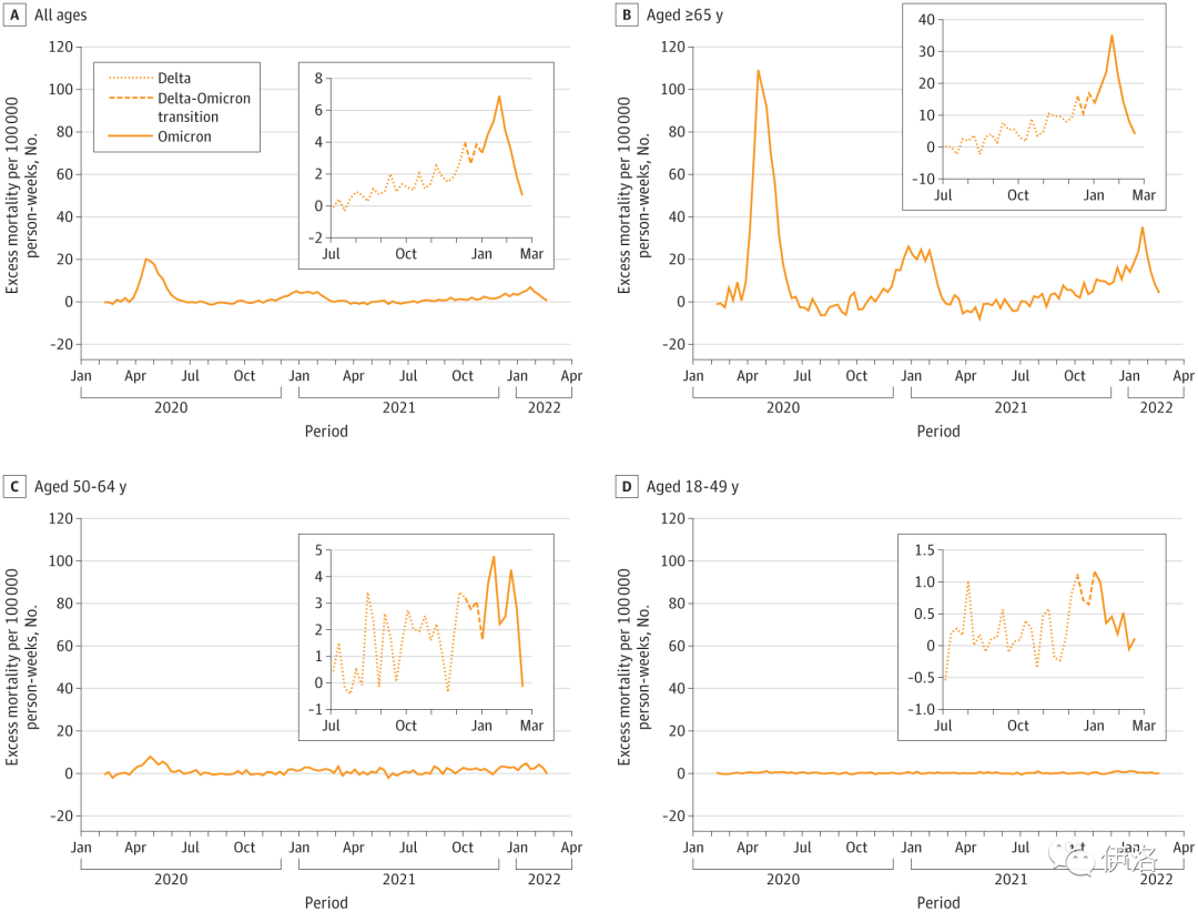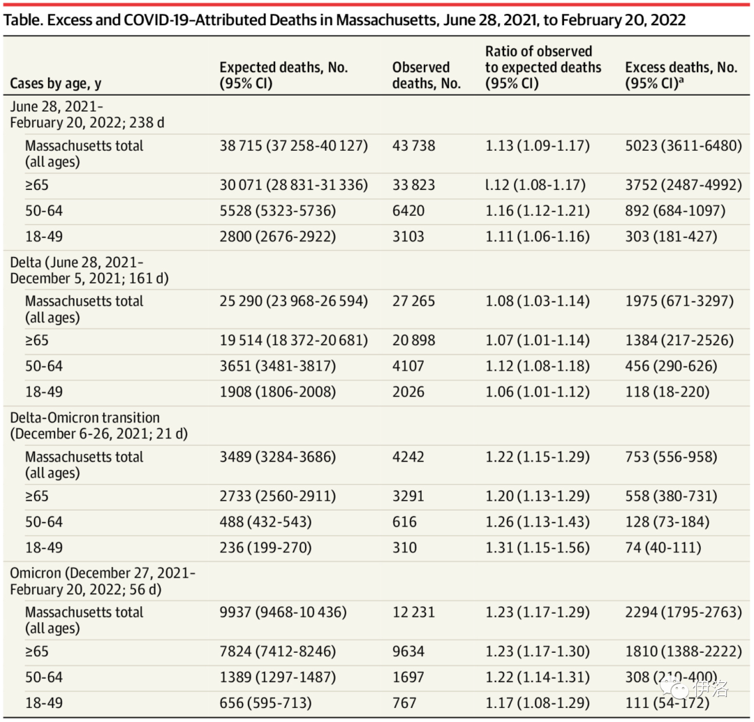 顶刊JAMA报道,美国麻省Delta、奥密克戎两波疫情的超额死亡数据,奥密克戎在更短时间内,造成了更高的超额死亡。麻省总人口690万人,集中了哈佛、MIT等全球顶级高校,医药领域全球知名药企/Biotech/医院荟萃,可以说是全球经济、医疗最发的地区之一。人口素质高,疫苗接种率也较高。23周德尔塔毒株时期,1975人超额死亡,6个月内总人口超额死亡率万分之2.86。8周奥密克戎毒株时期,2294人超额死亡,2个月内总人口超额死亡率万分之3.32。中间还有3周叠加期。两者合计不到8个月时间,超额死亡5023人,为总人口万分之7.28。奥密克戎8周时间,总死亡人数1.22万人,比预期的9937人高出23%。其中18岁以下预期死亡68人,实际死亡133人,超额65人,比预期接近翻倍。
