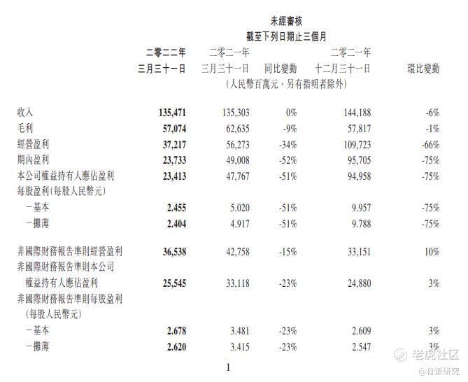在2022年第一季度,腾讯共实现营收约1354.7亿元,与去年同期持平,环比减少约6%。净利润约234.13亿元,同比减少约51%,环比减少约75%。