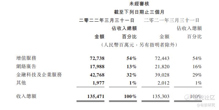 分业务看,增值服务仍是腾讯的收入主力,期内收入约727.38亿元,较去年同期的724.43亿元微增,占比约54%。
