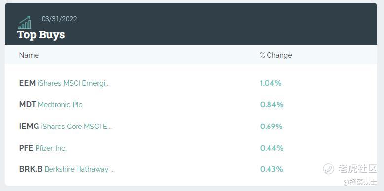 前五大卖出标的分别是:短期国债指数ETF-Vanguard(BSV.US)、Meta Platform(FB.US)、微软、标普500指数ETF、罗素2000指数ETF看跌期权(IWM.US,PUT)。