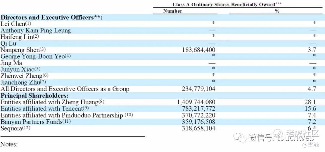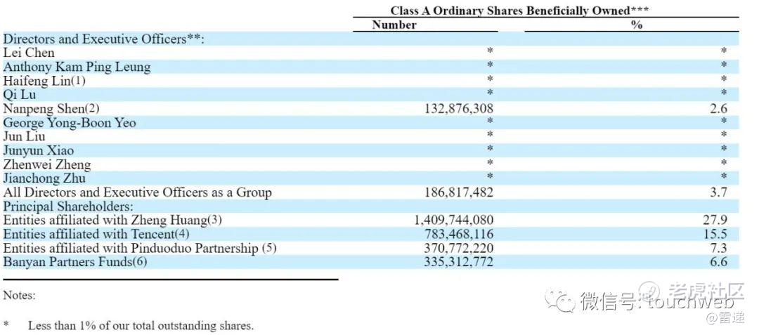 拼多多日前公布20-F文件,年报显示,截至2022年2月28日,拼多多创始人黄峥持股为27.9%,腾讯持股为15.5%,拼多多合伙人集体持股为7.3%,Banyan Partners Funds(高榕资本)持股为6.6%,红杉资本持股为2.6%。