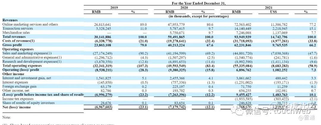 拼多多2019年、2020年、2021年净利分别为-69.68亿元、-71.8亿元、77.69亿元(约12.19亿美元)。