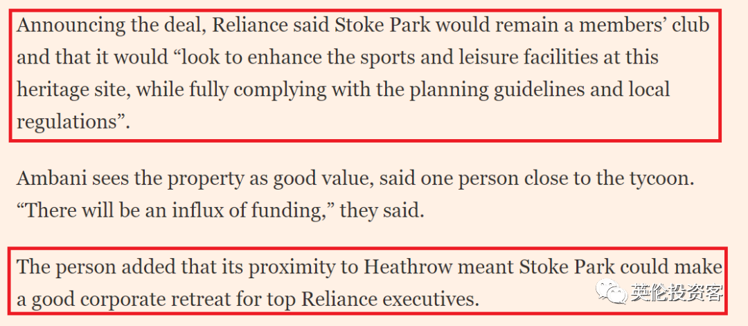 另外,英媒还在2021年4月26日报道称,信实集团已斥资5700万英镑,收购了英国著名庄园——斯托克公园(Stoke Park)。
