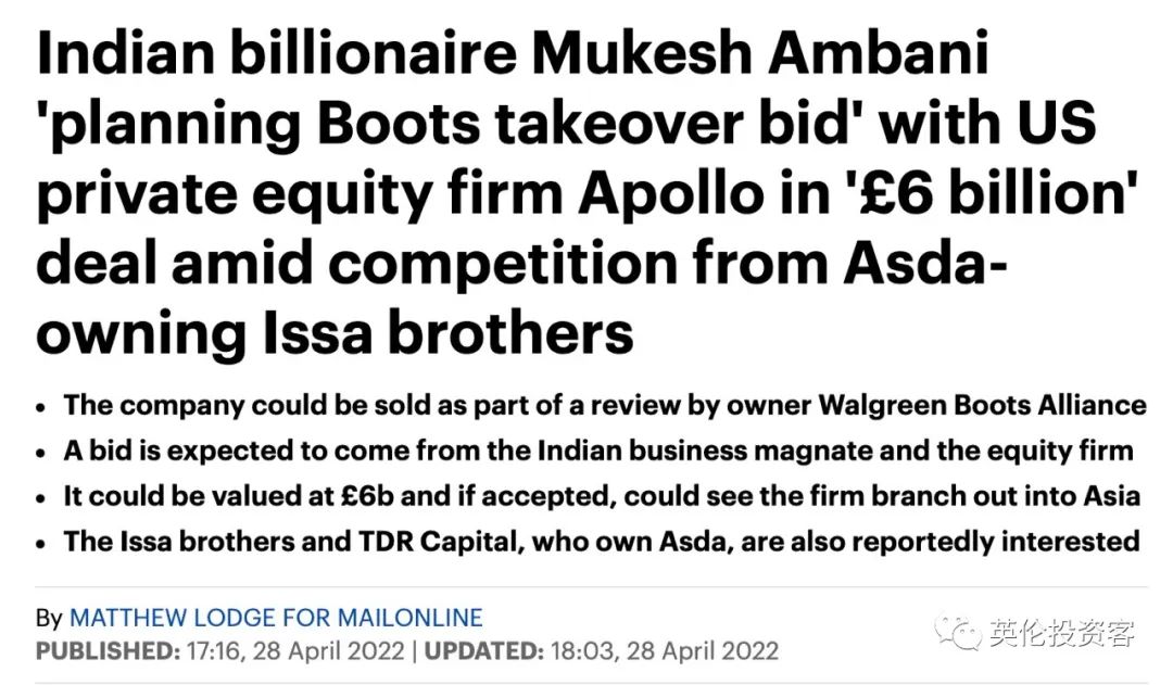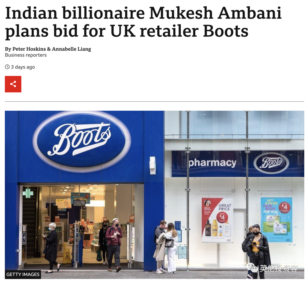 据悉,这次竞购Boots并非信实集团第一次收购英国资产,安巴尼家族已经在英国拥有价值数千万英镑的资产。