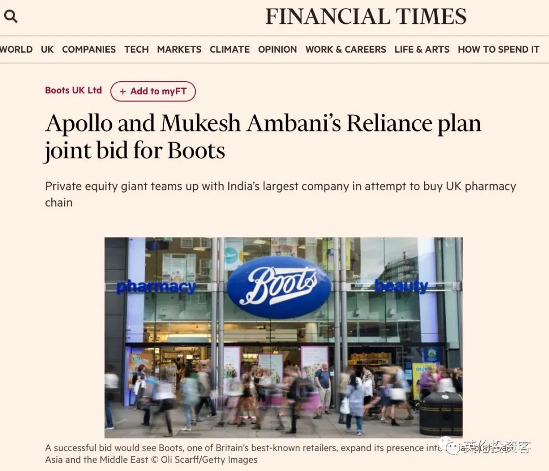 据BBC(4月28日)报道,总部位于孟买,印度第二大富豪穆克什•安巴尼(Mukesh Ambani)控股的信实集团(Reliance Industries)与美国投资公司阿波罗全球管理公司(Apollo Global Management)计划合作竞购Boots。