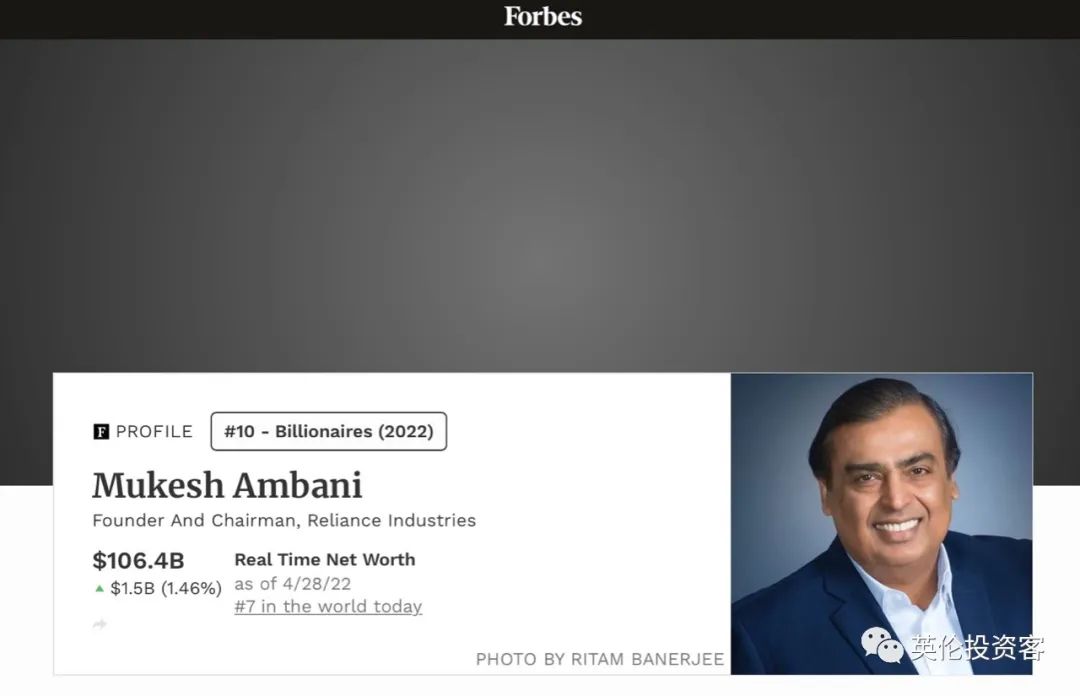 根据《福布斯》杂志的最新统计,65岁的安巴尼是全球第七大富豪,在印度富豪中排名第二,位列阿达尼集团(Adani Group)董事长Gautam Adani及其家族之后,净资产有1064亿美元。