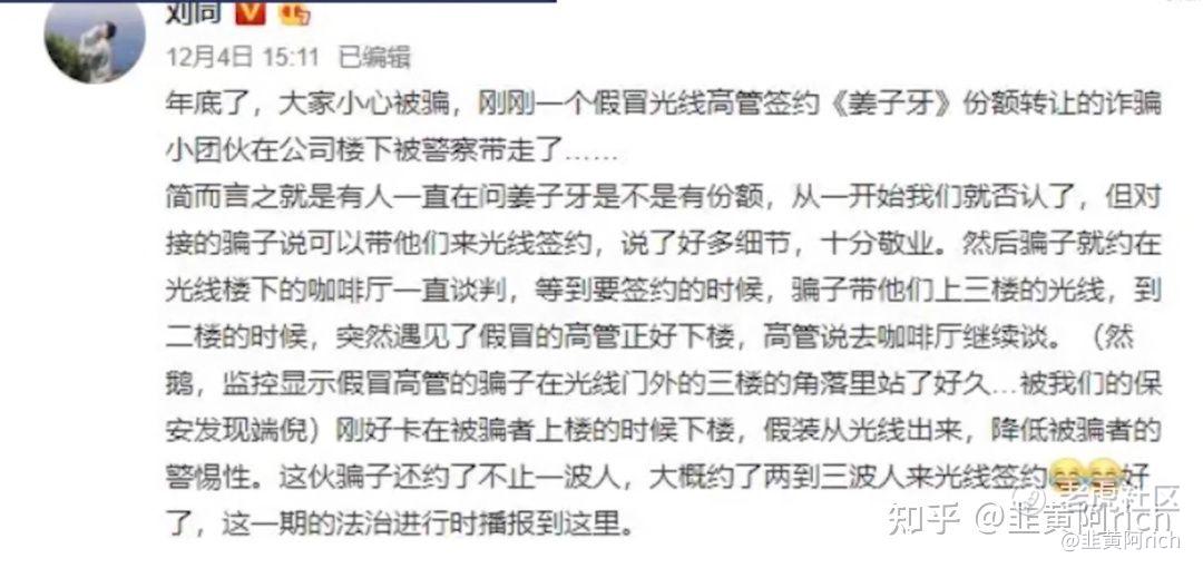 光线传媒的刘同也曾在自己的微博上爆料,有诈骗分子在光线总部进行影视投资诈骗。