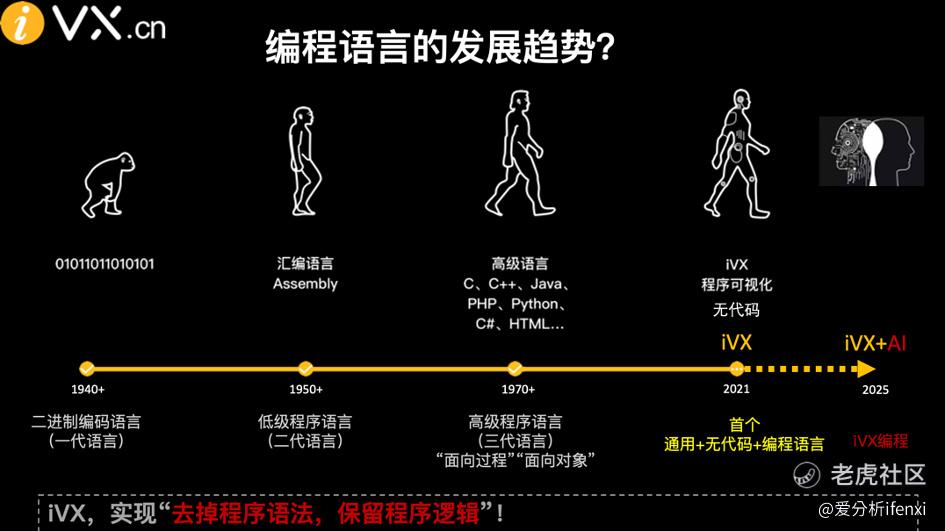 iVX甚至可以被视为是一种全新的“编程语言”,将“键盘编程”转化为了“鼠标编程”。具有“更低学习门槛”“更快开发/运维效率”“高质量代码生成”等特定。(如下图所示)