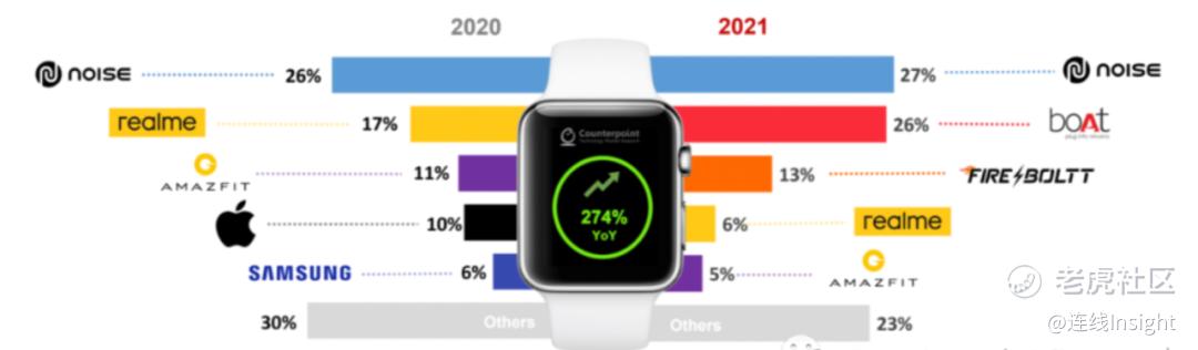 据Counterpoint的IoT Service最新研究显示,2021年印度智能手表市场出货量同比增长超过274%,创历史新高。印度本土品牌Noise以27%的份额在2021年领先着整个市场,印度国产品牌占据了市场总出货量的75%。