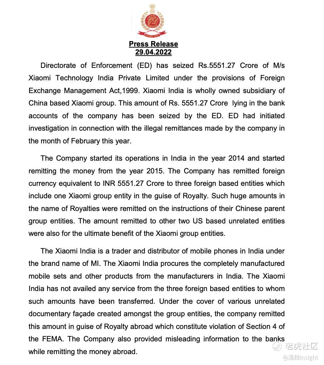 印度执法局提到,小米印度是印度手机贸易商和分销商,品牌为MI(即小米)。小米印度从印度制造商采购完整制造的手机和其他产品,小米印度并没有从三家外国实体获得任何服务,这些款项已经转移给这些实体。在集团实体之间创造各种不相关的文件伪装掩护下,该公司以特许权使用费的名义将这笔金额汇往国外,这违反了FEMA《外汇管理法》第四条。