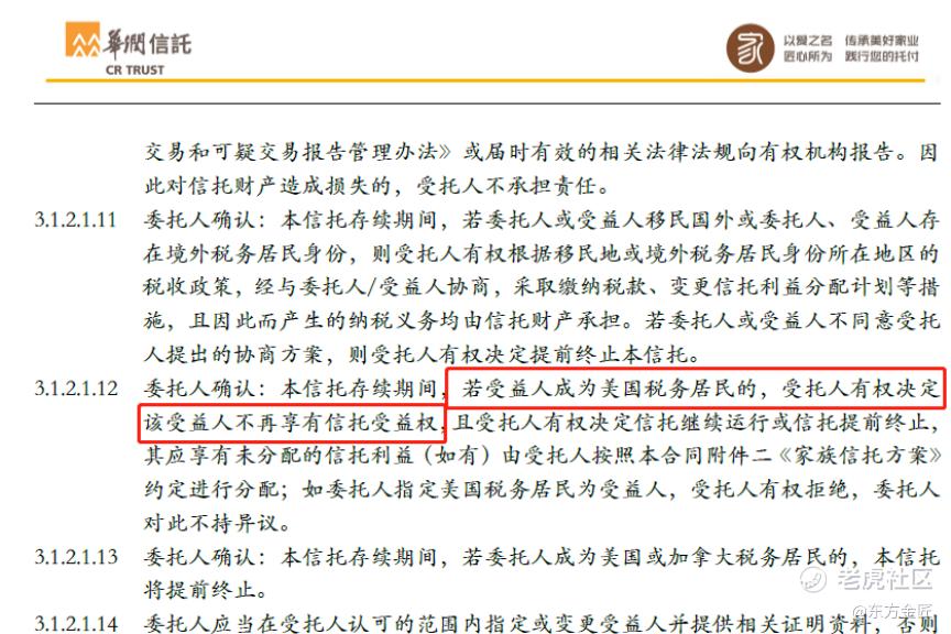 3、 如委托人或受益人变更为美国或者加拿大国籍,信托存在被强行终止风险,终止对受益人进行分配的风险等;(大部分信托公司无此条款)