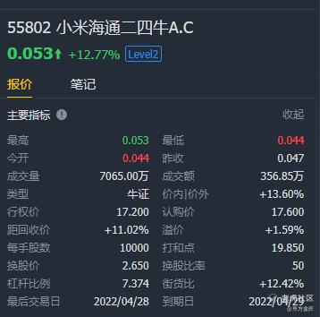 有效杠杆:小米股价上涨1%,窝轮价格上涨8.398%