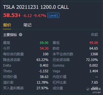 Delta:反映特斯拉股价变化对期权价格变化的影响,股价每变化1元,期权价格大约变化0.402。
