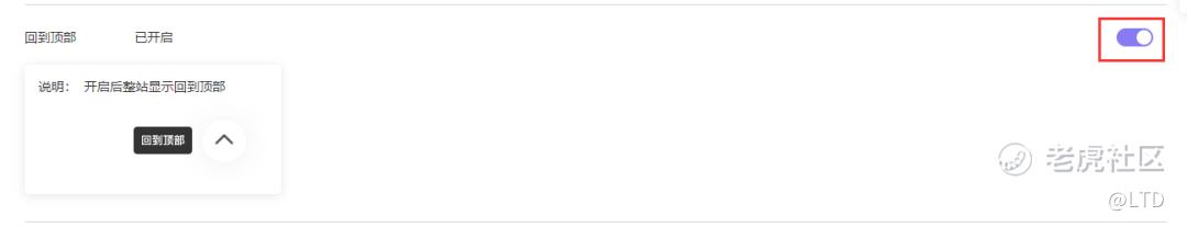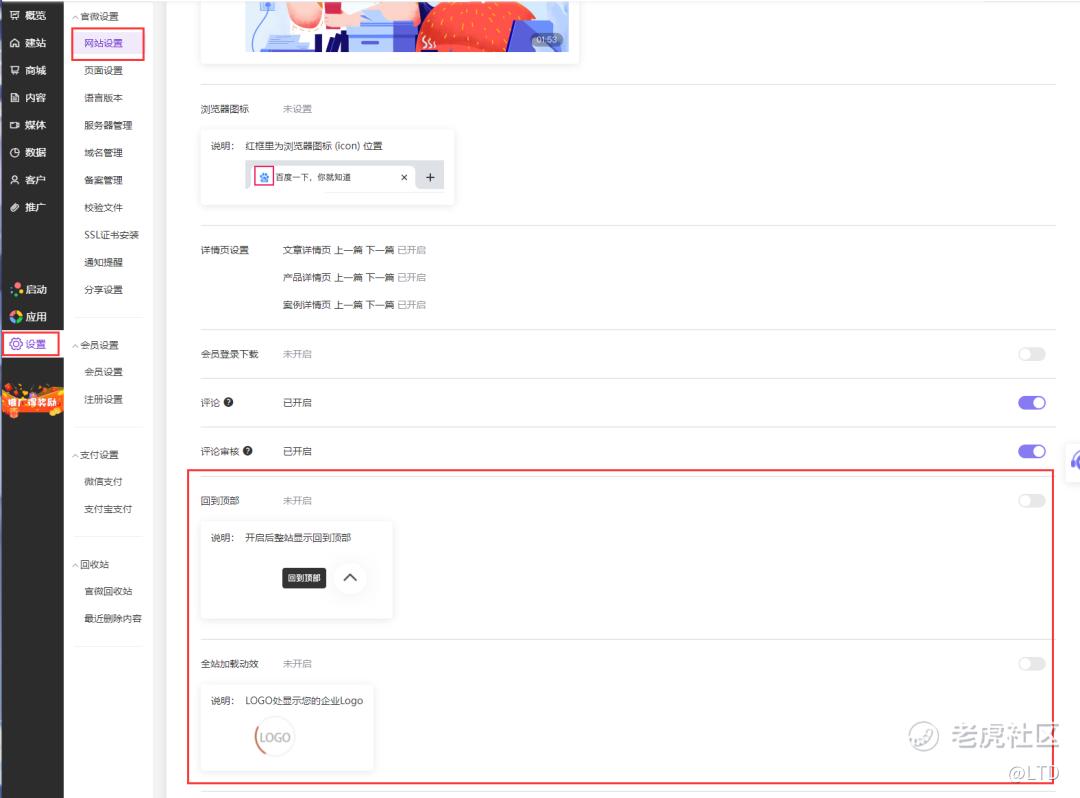 官微中心网站设置内新增“回到顶部”按钮的开启开关和全站加载动效的开关