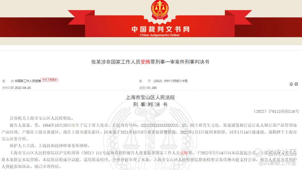 凤凰网财经讯4月26日,中国裁判文书网披一起案件显示,浦发银行总行私人银行部产品管理处原产品经理张某东利用负责金融产品的引入、发行、运营的职务便利,为他人谋取利益,3年时间非法收受他人贿赂205.37万元。张某东被判处有期徒刑三年,并处罚金10万元。天风证券、天弘基金、中信建投等多家金融机构被牵扯其中。