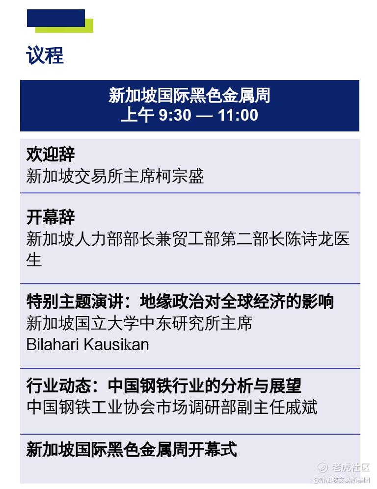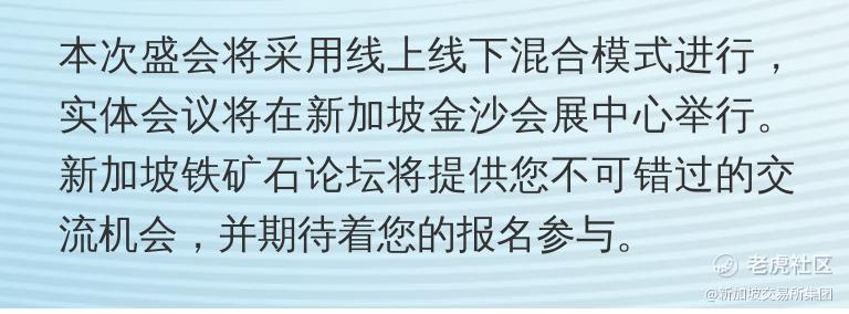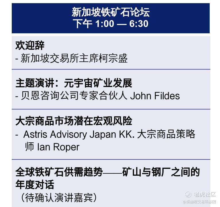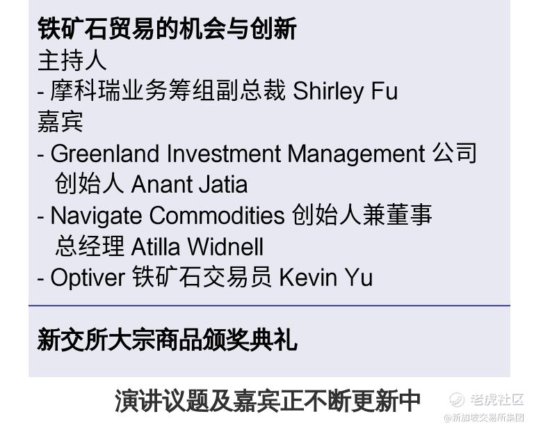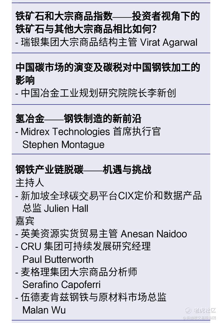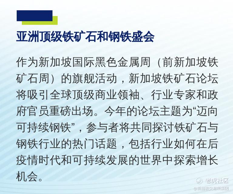 作为新加坡国际黑色金属周 (前新加坡铁矿石周)的旗舰活动,新加坡铁矿 石论坛将吸引全球顶级商业领袖、行业专家和政府官员重磅出场。今年的论坛主题为“迈向可持续钢铁”,参与者将共同探讨铁矿石与钢铁行业的热门话题,包括行业如何在后疫情时代和可持续发展的世界中探索增长机会。