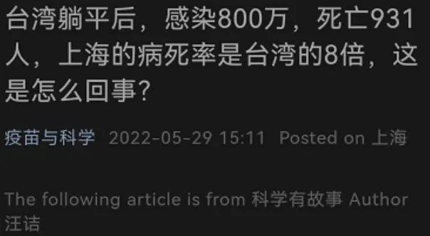台湾这些病死速度极快,微博@科学未来人 每日台湾疫情播报的情况,可以参考。截至5月29日“從染疫到死亡,47%落在3天內,33%落在3天到7天”。少数为“發燒,到院前死亡”。重症死亡率83%。很多或主动、或被动签署不抢救的DNR,不再赘述。这块高的重症死亡率,这么快的确诊后死亡,“科学”吗?3、分母特意放大,又不考虑黑数死亡台湾到今日实际报出近200万的确诊,为了让病死率低一些,该文章特意按照某篇流调的预估,调整为800万人。
