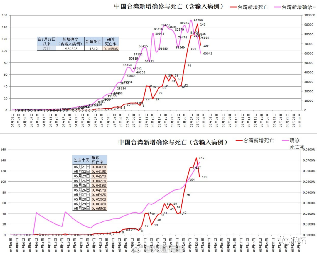 1、分子。疫情还处于高位时,计算病死率是胡闹…这么明显的错误还有人不知道吗?4月24日张用上海市当时汇总的87例死亡除以48.8万例感染,得出了0.0178%的病例死亡率。后续大家都知道了这个数值,在全国各省重症力量资源支援下,依然上升了超5倍(且养老院情况参考财新报道,似乎并未列入统计)。汪的这篇文章里,用台湾截止5月27日累计死亡931例来计算。大家可以看看微博@大道有形 老师每日疫情总结。台湾疫情正处于高峰期,每天报告死亡在快速增长,截至到5月29日报告的数字已经到了1203例,相较931增长30%。截至5月30日可能由于周末效应,报告死亡小幅下滑到109例总数到1312例,较931增长超40%。