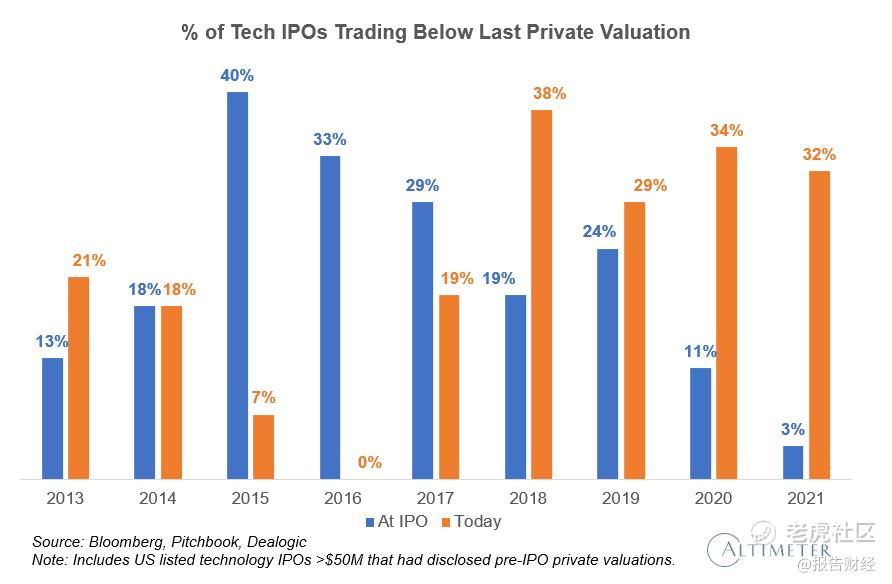 美国ARK基金团队由此指出:“我们认为,这些数据表明,公开市场的投资者正在拒绝由风险投资家和投资银行家所设定的初创公司的晚期和IPO估值。”