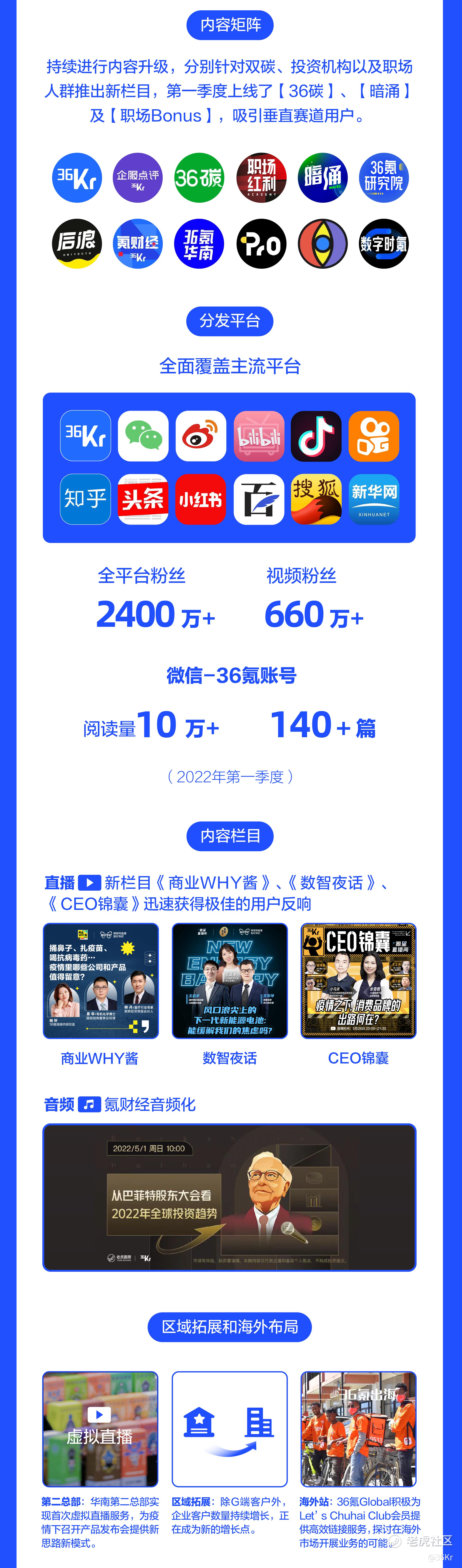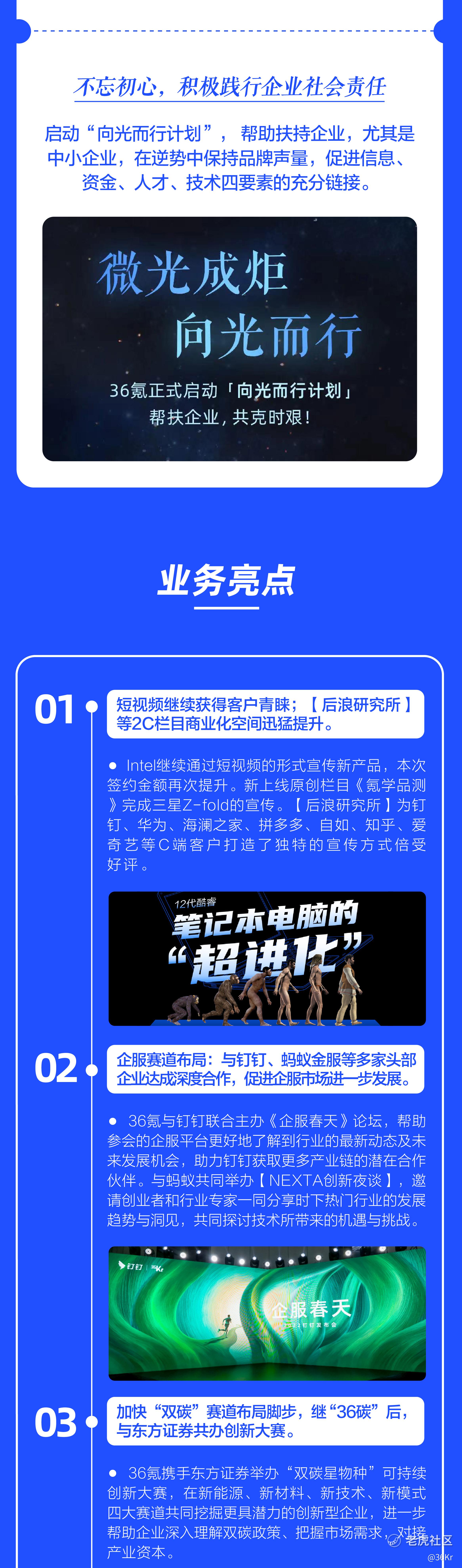 36氪发布2022年Q1财报,总营收同比上涨14%,净利润创IPO以来新高达3262万,并连续两个季度盈利。广告收入同比增长13%,超同行业平均水平,客户数以及客单价双增。企业增值服务收入逆势增长,同比增幅达35%。企服点评平台运营数据持续高速增长,商业化前景可期。