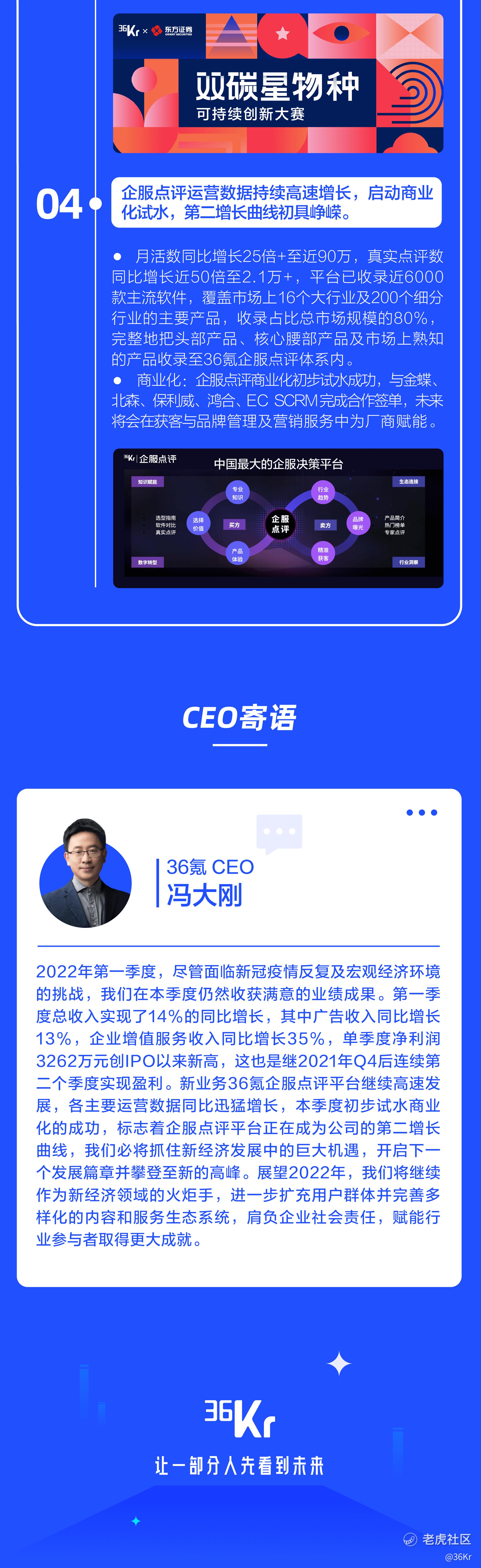 2022年Q1,36氪总营收同比上涨14%,净利润3262万,连续两季度盈利,广告收入同比增长13%,企业增值服务收入逆势增长,同比增幅达35%。企服点评平台运营数据持续高速增长,商业化前景可期。$36氪(KRKR)$