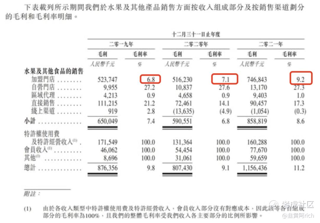百果园自家的招股书上也写得很明白,2019年至2021年,旗下加盟门店毛利率分别为6.8%、7.1%、9.2%。
