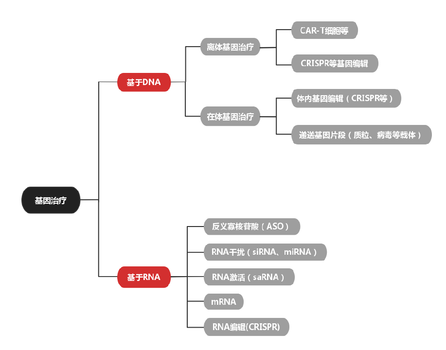 目前基因治疗药物按照DNA和RNA分为两类,分别包括离体基因治疗(CAR-T细胞、CRISPR等基因编辑)、在体基因治疗(体内基因编辑、递送基因片段)、反义寡核苷酸、RNA干扰、RNA激活、mRNA、RNA编辑等产品。谈起基因治疗,药物递送方法和基因编辑工具是不可回避的话题。
