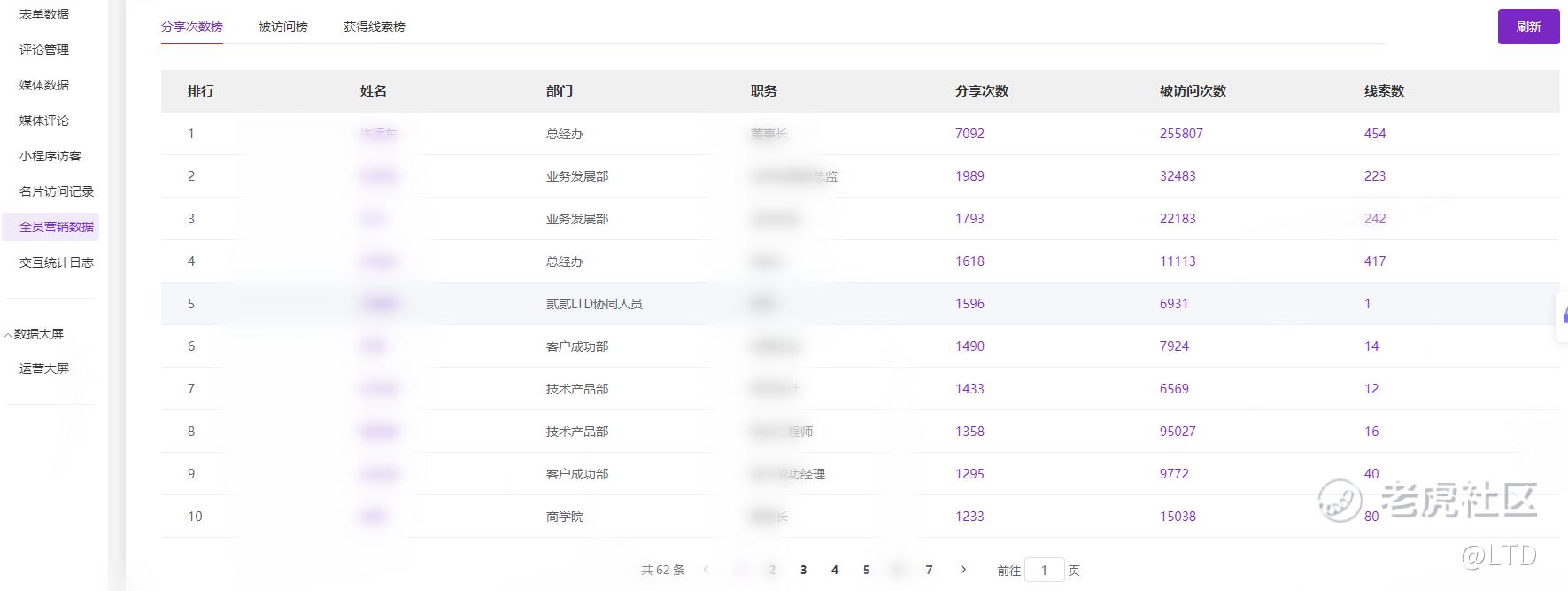 营销SaaS后台不仅支持内容分发,还支持分发数据回流。管理者可以通过数据中台看到员工分享的情况,每位员工的分享次数、被访问次数、线索数等都清晰可见。员工的努力能被看到,管理者也可以根据数据实施一些激励策略。这样的良性循环将会让员工持续保持参与全员营销的积极性。