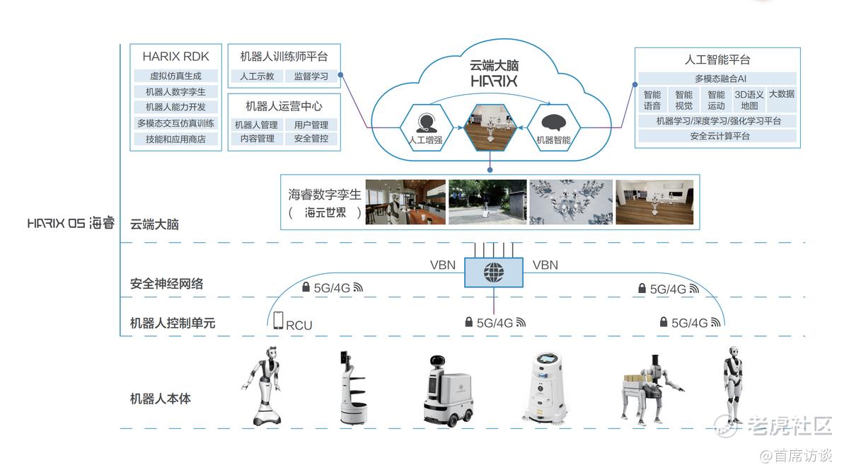 基于“云-网-端”的架构,达闼打造了全球首个面向机器人的操作系统——海睿OS(HARIX OS),通过调度云、网、边、端的各种运算资源使得云端机器人具备各种智能。