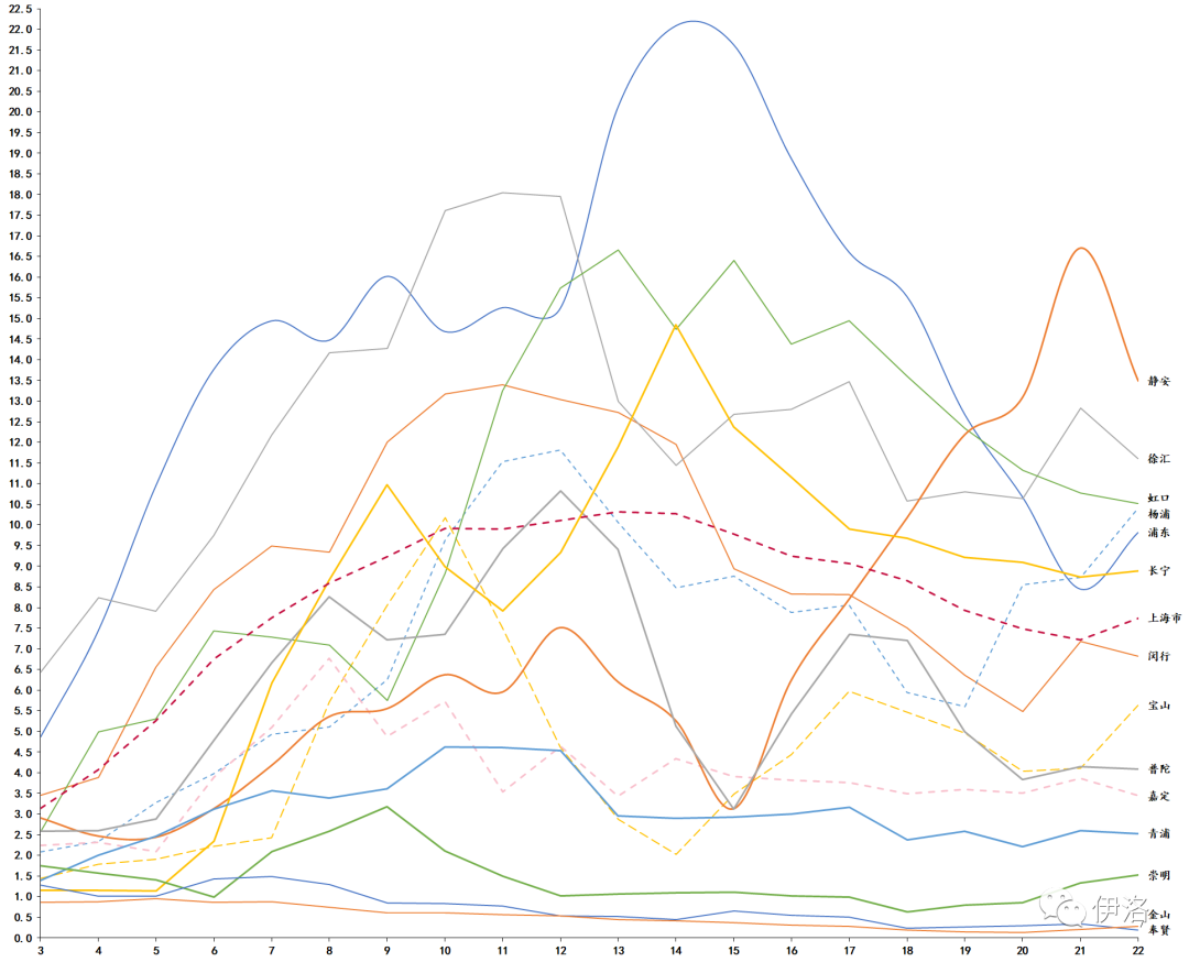 由此,按照3日平均计算各行政区日常住人口新增感染率数字,可以更好反映出趋势。由于黄浦区日增感染率数字是上海3-4倍,作为特异值不显示了。