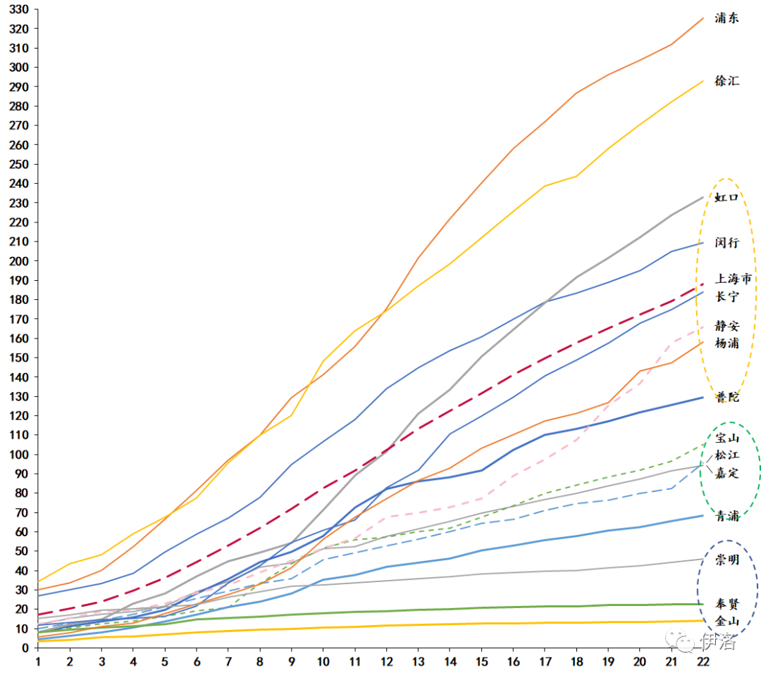 内环核心区,黄浦、静安、徐汇、虹口、杨浦、长宁,可以看到均处于高位,超出上海市平均,时不时出来一个异常值拉高整体数据。有点像一两周前的浦东,不知底数是否摸清。