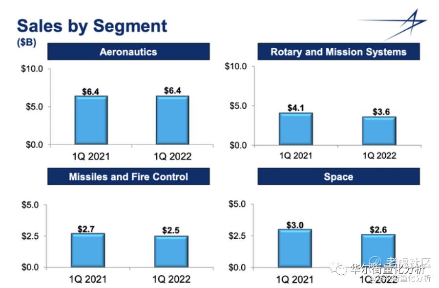 按细分市场划分的销售额实际上表明本季度非航空non-aeronauticsegments细分市场可能出现更大的问题,Rotary and Mission Systems收入下降约 14%至 35.5 亿美元,太空下降约15%至 $2.56B,导弹和火控下降约 11 % 到 $2.45B。航空收入实际上与去年同期持平或略有增长,第一季度约为64 亿美元。