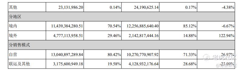 分地区看,全年境内收入约114.39亿元,占比从去年的85%降到70%左右,收入额同比减少了6.67%。同时境外收入同比增长约123%至47.78亿元,占比提升到近30%。