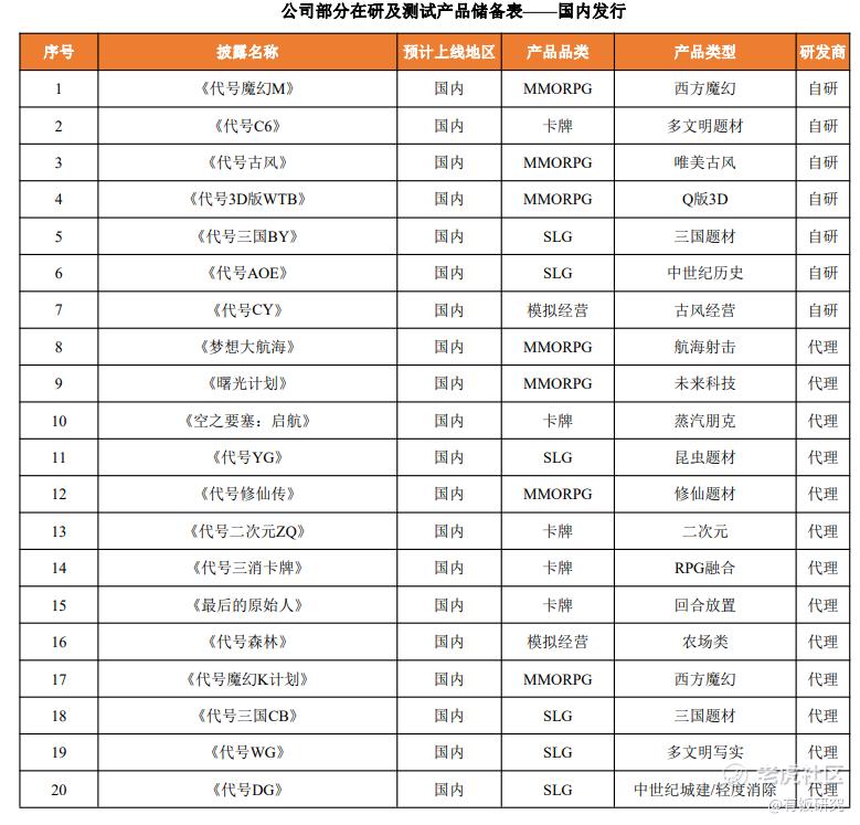 最后,财报称,目前三七互娱手中还在研近40款游戏新品,其中主要面向国内市场的有20个,以MMORPG、SLG、卡牌为主,代理居多,题材多元。