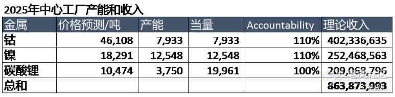 上面两张图分别是有效金属含量(以源头幅工厂进料吨数计的百分比)的预测和金属价格的预测,其中金属价格的展望是综合多家外国投行交易部门的预测(其实就是接近现在的价格)。我们有用2025年的中心工厂的产能来验算一下,假设幅工厂产出作为中心工厂的投料,只计算中心工厂的产出: