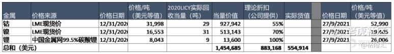这360吨黑物质中实际回收得钴29吨,镍31吨,锂9吨。2020年底的三种金属价格(伦敦金属交易所价格)如下表: