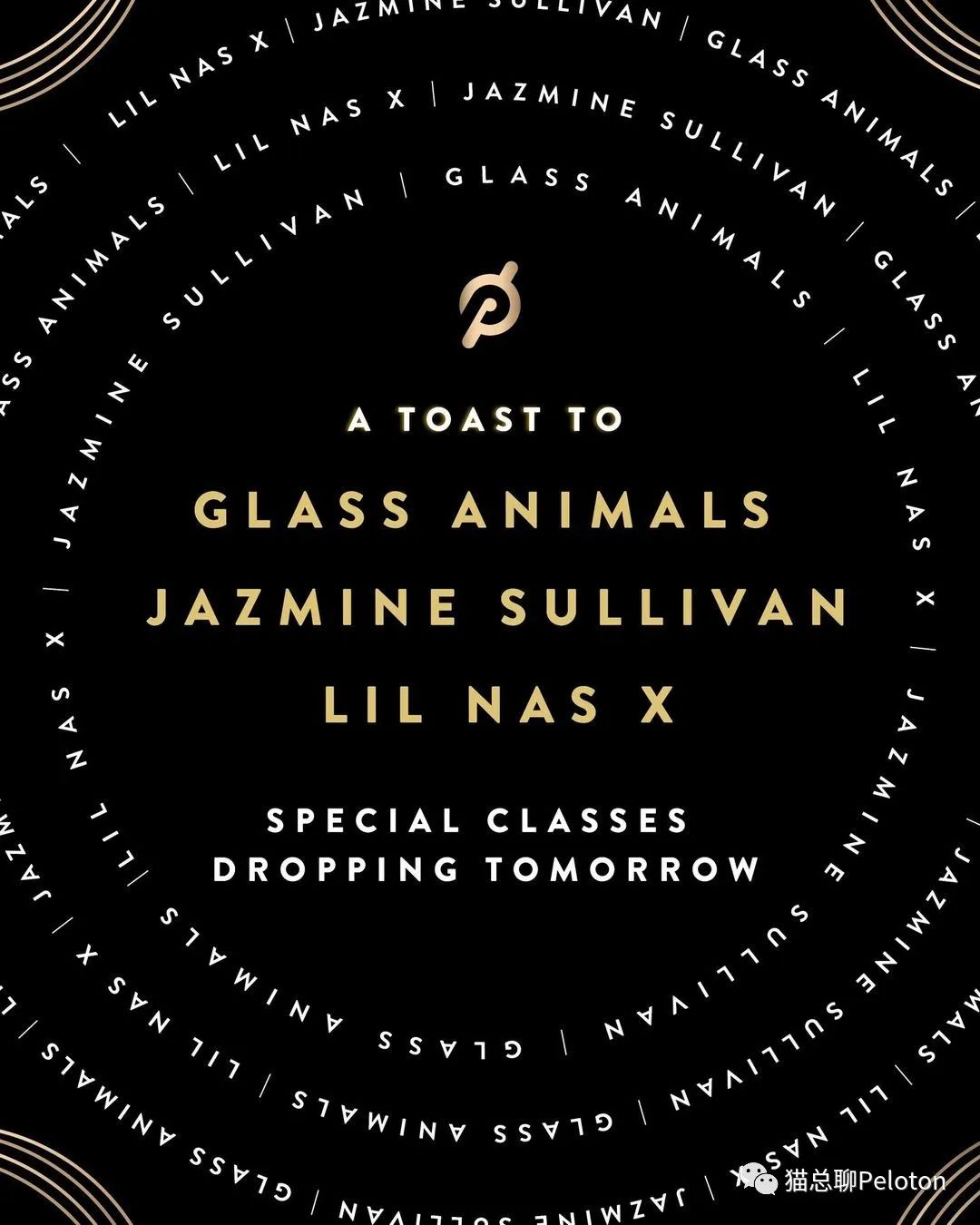 3/31,Peloton 宣布将从周五开始上线一个与 2022 年格莱美奖有关的小型艺术家系列课程[4]。该系列的三位艺术家:Glass Animals、Jazmine Sullivan 和 Lil Nas X 都获得了格莱美奖的提名。授课教练包括 Anna Greenberg、Hannah Frankson 和 Robin Arzón。