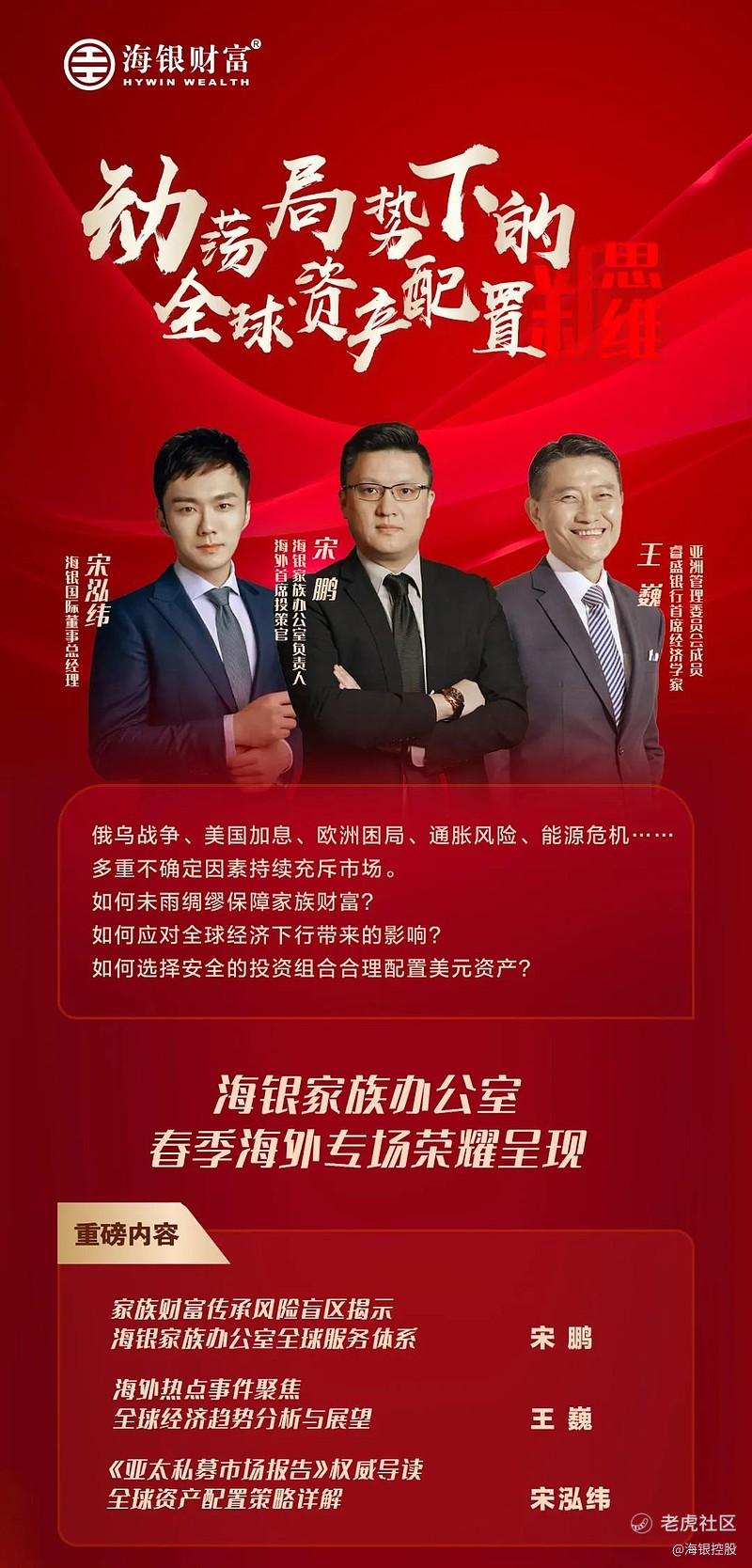 海银家族办公室负责人兼海外首席投策官宋鹏先生,携手欧洲睿盛银行首席经济学家、亚洲管理委员会委员王巍先生,与香港证监会持牌机构海银国际董事总经理宋泓纬先生,于4月2日在空中就全球资产配置这一热点话题,为市场奉献了一场角度独特、风格鲜明的精彩分享。