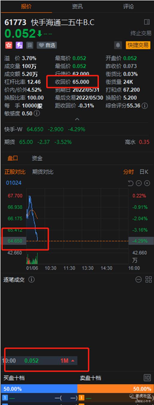 怎么觉得我说起来也很绕口,还是举例子吧。下图是我在盘中的截图,可以看到回收价是65.00,现价是64.65,意味着该牛证已经触及回收价。