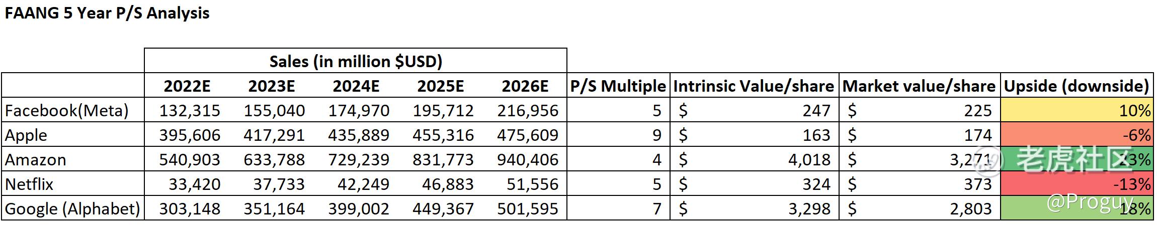 Using the sales estimates from analysts, I forecasted the revenue for each FAANG name for the next five years. I then assigned them a P/S multiple based on their historical average and calculated their intrinsic value based on a discount rate of 10%. Comparing the FAANG names to their current market value, it can be seen that Amazon is the most undervalued followed by Alphabet. Meta is slightly undervalued after its recent selloff but carries uncertainty regarding the future of its Metaverse business. Although Apple is a very good company, it is slightly overvalued at the moment while Netflix is the most overvalued after adjusting for its cash-burning streaming business.