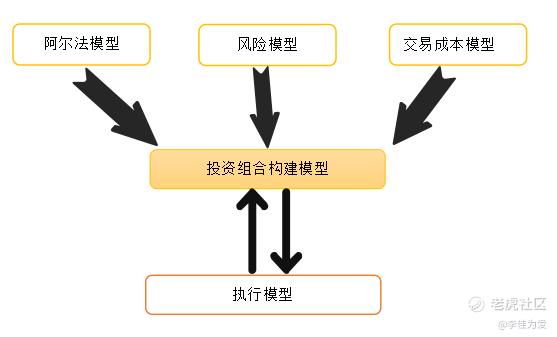 量化交易系统的框架包含3个模块:阿尔法模型、风险模型和交易成本模型。这3个模型构成易网行的投资组合构建模型的输人变量,而投资组合构建模型与执行模型又有相互作用的关系。