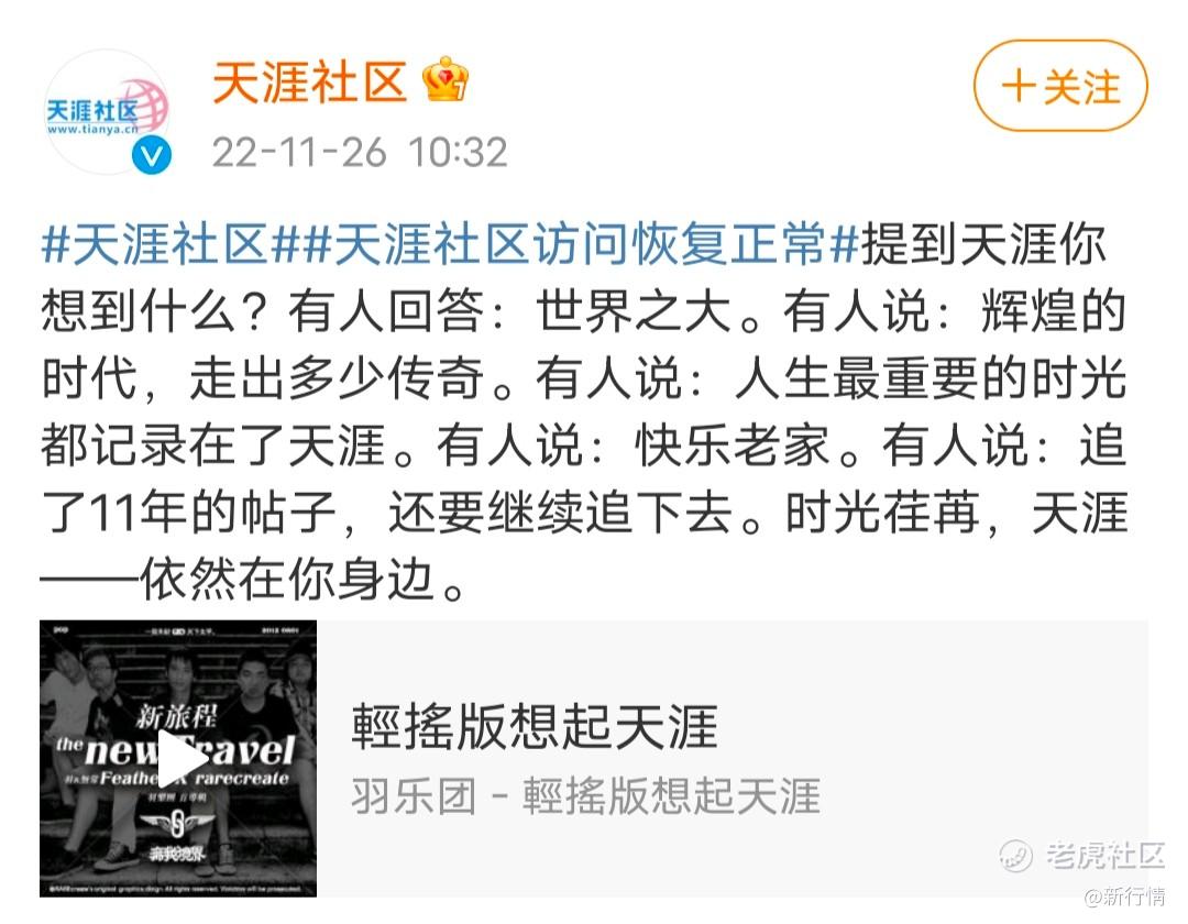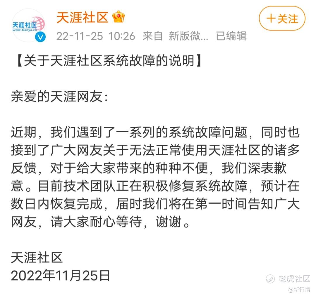 11月26日,天涯社区官宣已经恢复了正常访问,且论坛发帖日期也更新到了最新日期。