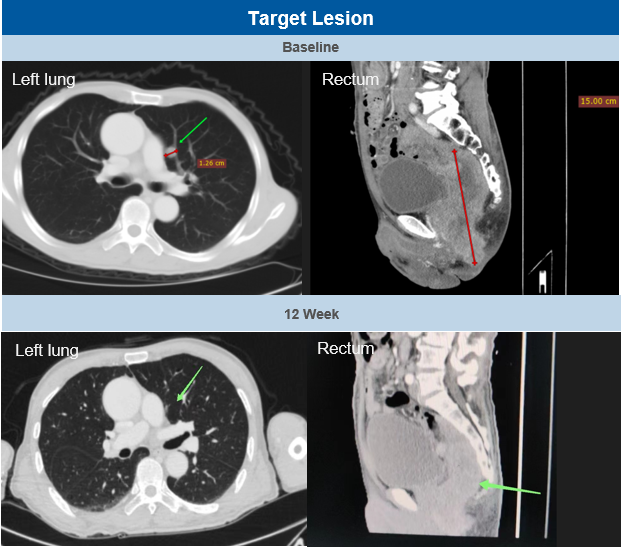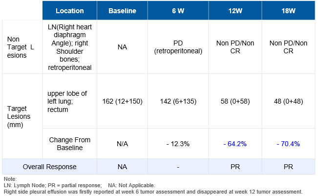一位70岁亚洲男性黏膜黑色素瘤(mucosal melanoma)Ⅳ期患者在经过porustobart联合特瑞普利单抗每3周给药一次治疗后,在第6周时经历了非靶病灶“假进展”,在第12周及第18周时完善影像学检查均被评估为部分缓解(PR, partial response),靶病灶分别缩小64.2%和70.4%。该患者既往经过一线的帕博利珠单抗 + 达卡巴嗪 + 顺铂 + 贝伐珠单抗系统性治疗,因疾病进展停药,为抗PD-1抗体治疗失败的患者。