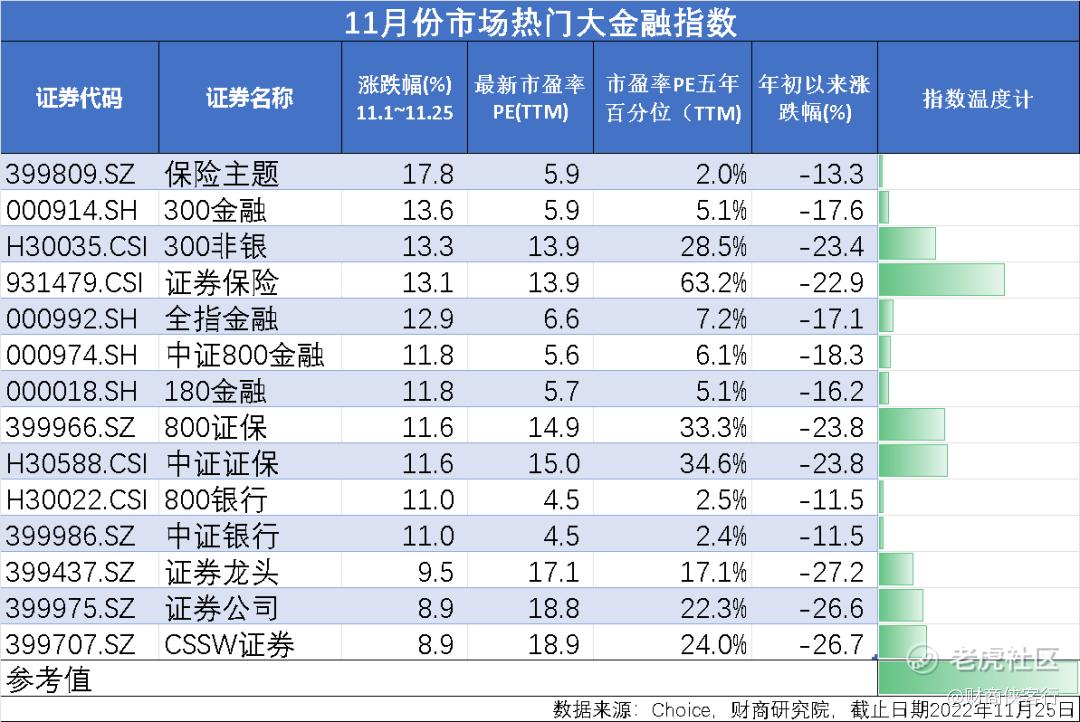 和其它大盘板块一样,经历了10月份一轮较大的杀跌之后,金融板块进入11月份之后开始反弹,其中申万非银金融11月份以来就已经上涨10.7%。