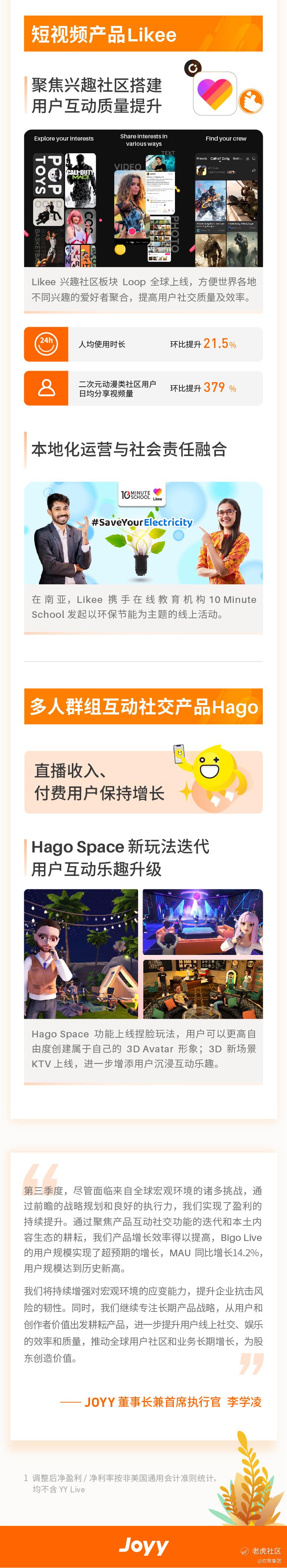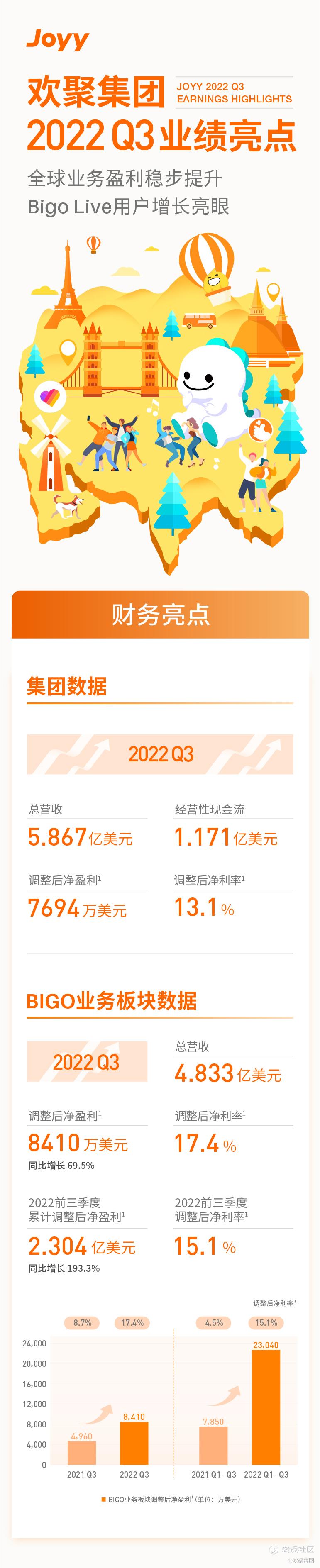 ②BIGO板块2022年前三季度累计实现净盈利2.304亿美元,同比增长193.3%;