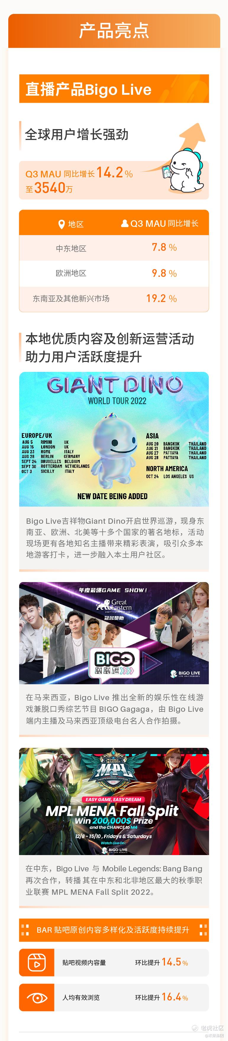 ①全球业务盈利稳步提升,集团Q3营收5.867亿美元,净盈利7694万美元,净利率13.1%;BIGO净盈利8410万美元,净利率17.4%;Bigo Live Q3 MAU同比增长14.2%至3540万,用户规模达历史新高;
