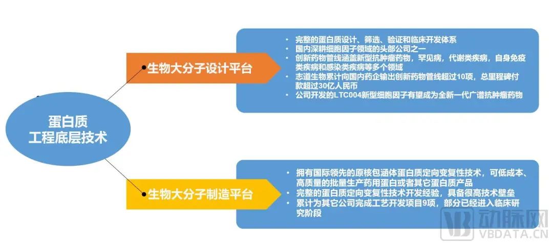 在生物大分子设计平台方面,志道已建成靶点发现与蛋白质分子工程学设计、高通量蛋白质筛选与活性鉴定、蛋白质药物成药性改造和临床开发四个核心技术平台。平台化的发展思路让志道生物拥有了强大的产品及管线拓展能力。先进的分子设计理念加上快速强大的蛋白质筛选能力及制造能力,使志道能够快速完成创新型蛋白质分子设计思路及活性的验证,突破现有专利壁垒,并有效地降低研发项目成本。